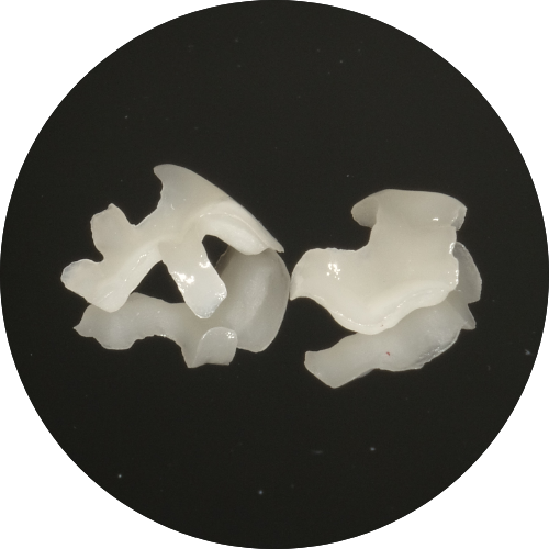 ジルコニアは、セラミックの一種である二酸化ジルコニウムでできた素材です。人工ダイヤモンドとも呼ばれており、強度と耐久性に優れています。かみ合わせの強い方や、奥歯に適しています。オールセラミックと比較すると、審美性はやや劣りますが、近年では天然歯のような色調の再現や透明感を出すことも可能になっています。