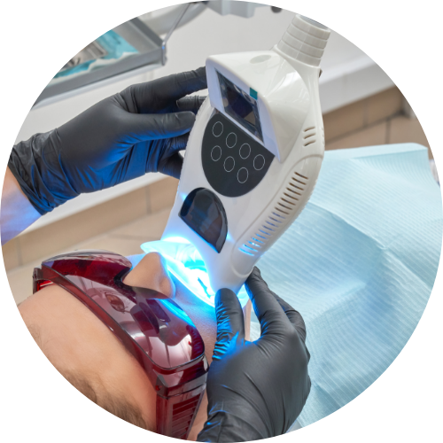 - 歯茎や唇を保護したあと、薬剤を塗布して光を照射します。患者様によって異なりますが、1回の施術で薬剤の塗布とライト照射を2~3回繰り返します。