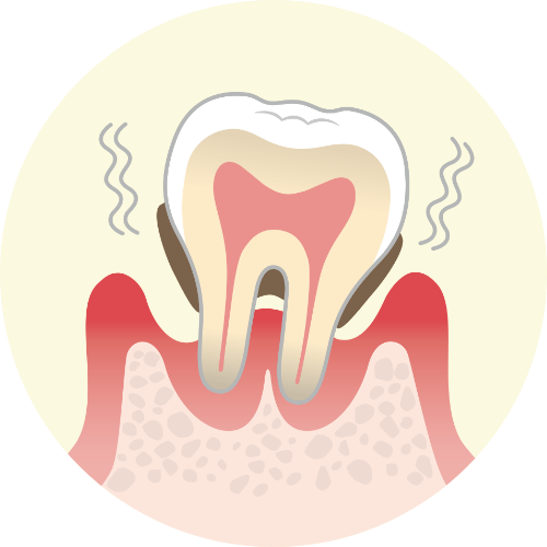 歯を支えている骨が減り歯がグラグラしてきます。重症化してしまうと抜歯を伴うことも少なくありません。自然脱落をすることもあります。